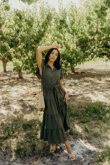Elegant maxi length dress featuring a tiered skirt, natural waist tie detail, and charming button-adorned ruffle sleeves. A timeless silhouette per...