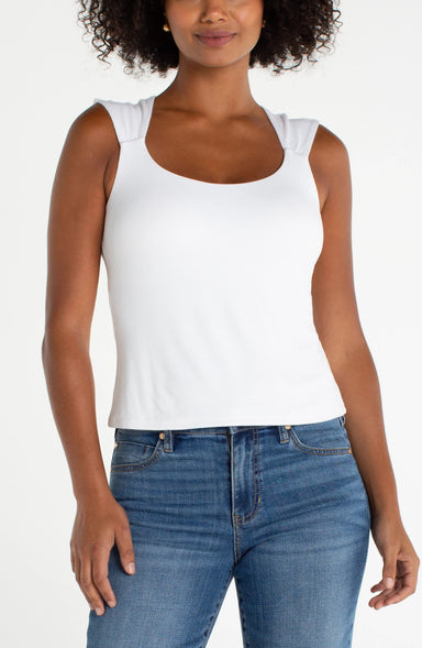 Ribbed tank with decorative detail on neckline and sleeves. Fabric Content: 50% Viscose, 28% Polyester, 22% Nylon