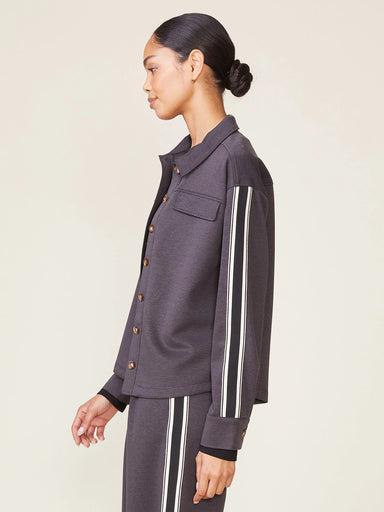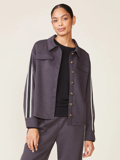 Our fine rib scuba sets the stage for this button front shirt that doubles as a jacket. Stripe taping accents the sleeve. Pair back to the Fine Rib...